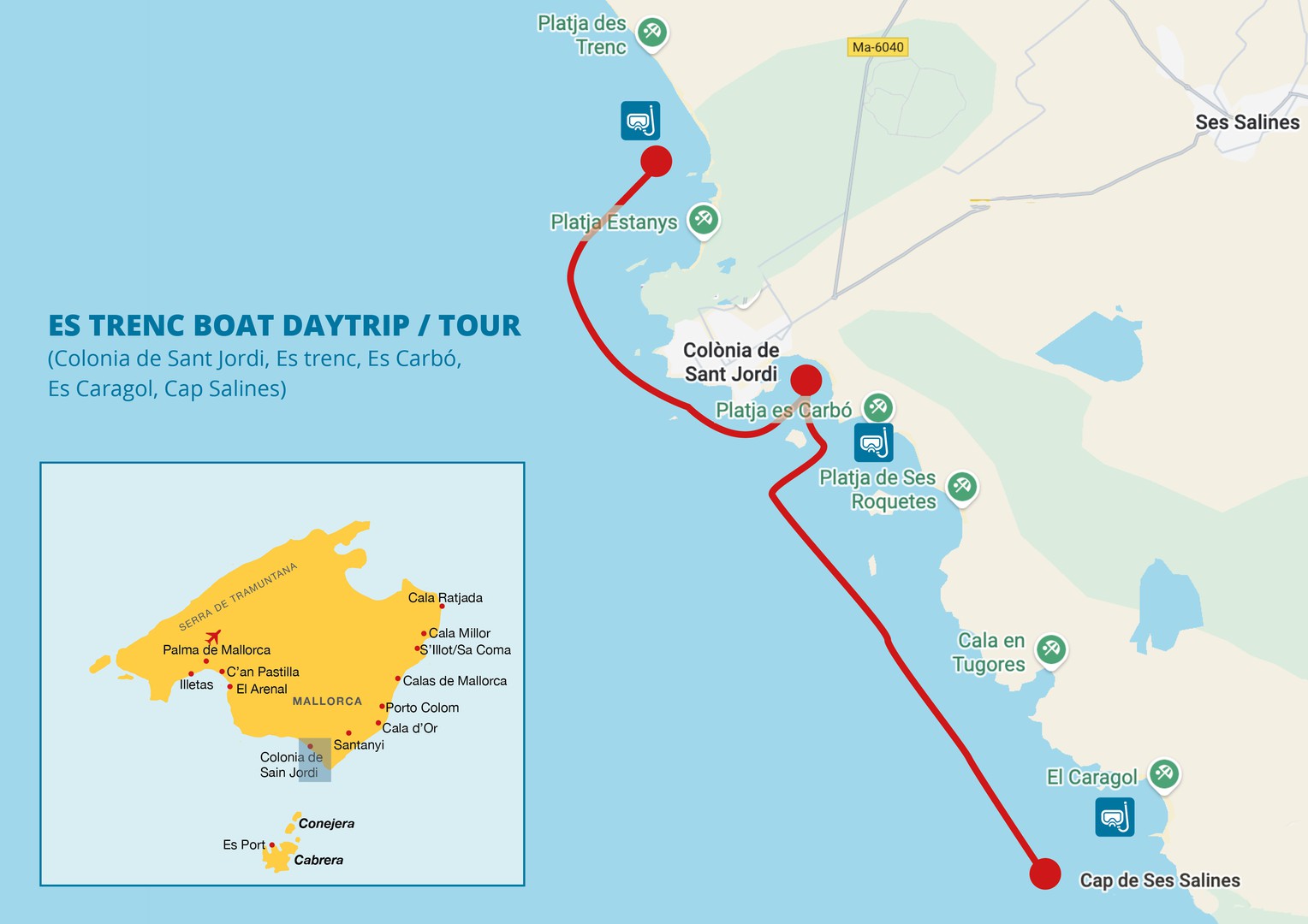 Desde el puerto de Colonia de Sant Jordi navegamos sobre las aguas azules de la hermosa costa sureste de Mallorca hasta llegar a Cap Salines. Realizamos una parada en una de las calas, donde podrá practicar snorkel, lo que le permitirá explorar la fascinante vida submarina en aguas cristalinas. Mientras disfruta del Sol, la música y el mar, la tripulación a bordo prepara una deliciosa barbacoa para que la pueda disfrutar en este entorno exclusivo. Después navegamos suavemente al Paraíso - La playa de ES TRENC. Realizamos una segunda parada para hacer tus mejores recuerdos de este momento paradisíaco.